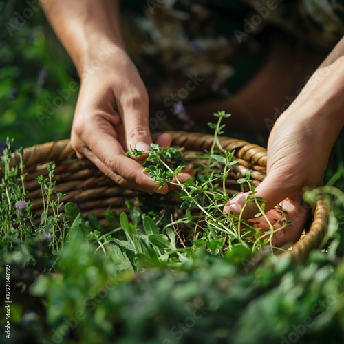 Hands gently harvest aromatic herbs, placing them into a woven basket. The sunlight enhances the vibrant greens, showcasing the beauty of homegrown, sustainable living