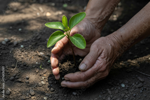 Hands gently hold a small plant seedling with green leaves ready to be planted in the garden soil for growth and environmental sustainability