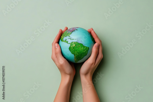 Hands gently holding a miniature globe representing Earth on a light green background, emphasizing care for the planet