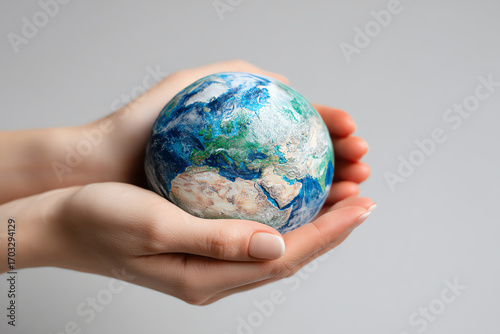 Hands gently holding a small globe showing Europe, Africa, and parts of Asia against a neutral background, symbolizing care for the Earth and global responsibility