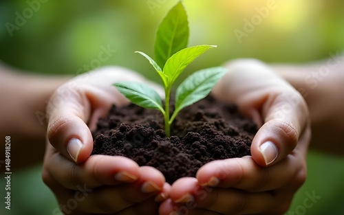 Hands gently holding a young green plant with fresh soil against a blurred green background.