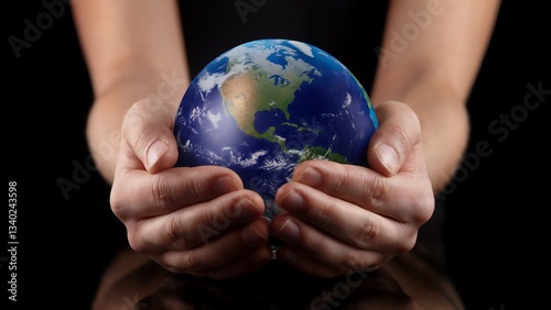 Hands gently holding the Earth, symbolizing care, sustainability, and global responsibility