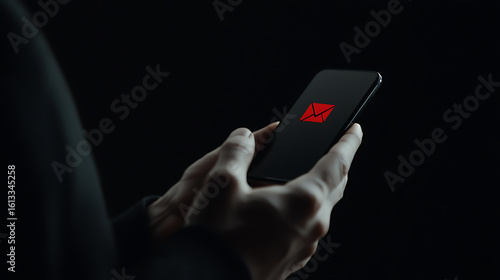 Hands hold a sleek phone displaying a red envelope icon, symbolizing digital communication. The dark background enhances the sense of privacy and urgency.
