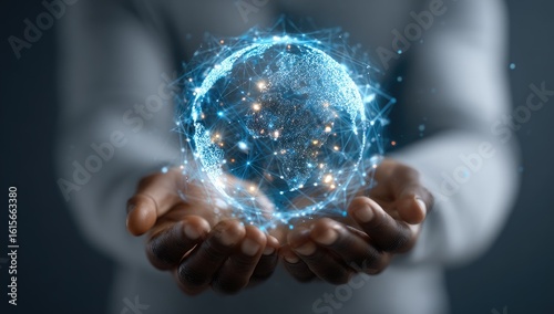 Hands hold digital Earth, glowing network