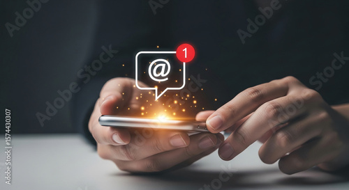 Hands hold phone, displaying email notification with glowing particles. Illustrates digital communication and new message alert