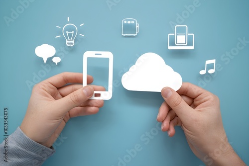Hands hold smartphone, cloud cutouts, icons suggest digital connectivity theme