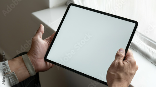 Hands holding a blank tablet near a window with natural light, suggesting technology, potential, and a vast scope of possibilities.