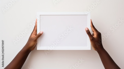 Hands holding a blank white frame against a light background for creative use in projects or designs