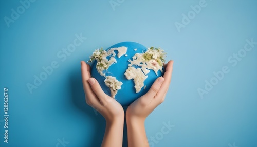 Hands holding a globe-shaped world map made of flowers against a blue background, symbolizing environmental protection