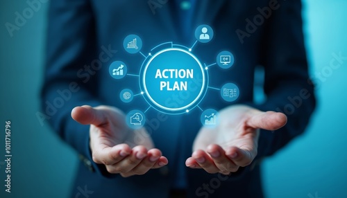 Hands Holding a Glowing Action Plan Icon Surrounded by Business and Strategy Icons - Perfect for Strategic Planning and Business Presentations