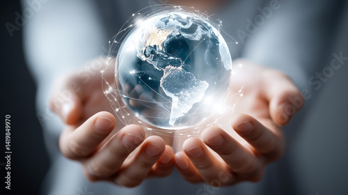 Hands Holding a Glowing Digital Globe - Global Connection Concept