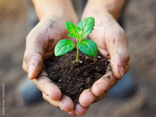 Hands holding a small green sprout in soil.