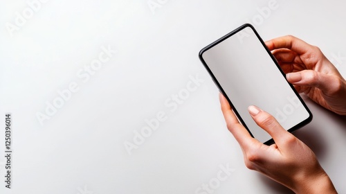 Hands holding a smartphone with a blank screen against a clean, minimalistic background