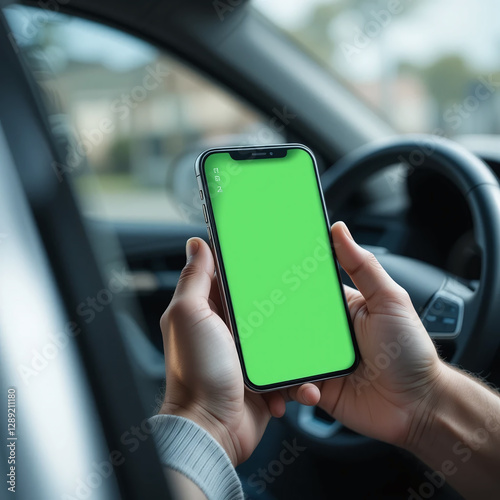 Hands holding a smartphone with a green mock-up screen inside a car, with a sharp foreground and blurred background, symbolizing technology and mobility.