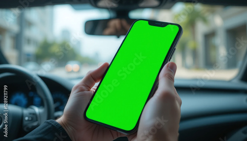 Hands holding a smartphone with a green mock-up screen inside a car, with a sharp foreground and blurred background, symbolizing technology and mobility.