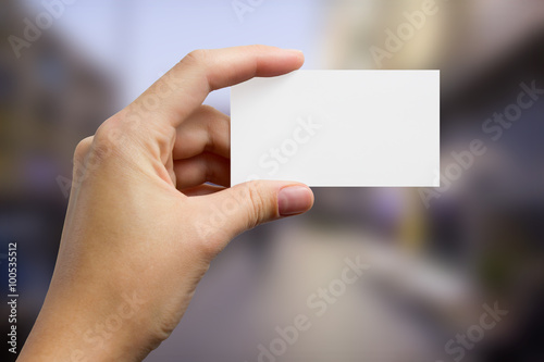 Hands holding a white business visit card, gift, ticket, pass, p