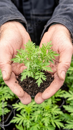Hands holding a young green plant with soil, surrounded by other seedlings in a nursery