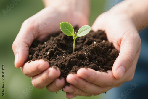 Hands holding a young plant sprout with care, symbolizing new life and growth in nature's soil