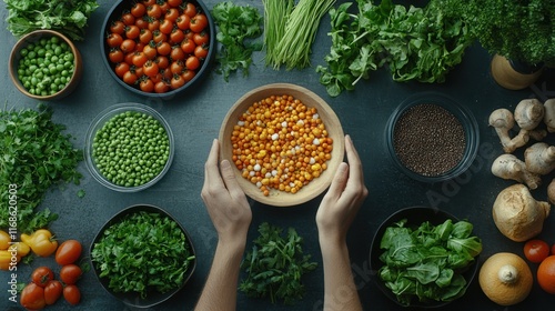 Hands holding bowl of dried corn kernels surrounded by fresh vegetables on dark surface.