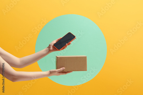 Hands holding cardboard box and smartphone