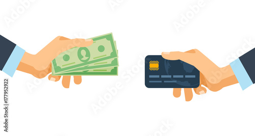 Hands holding credit plastic card and money bills. Financial operations.