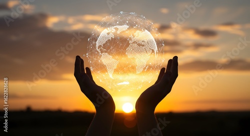 Hands Holding Digital Sphere, Sunset Connectivity Symbol, Technology Meets Nature, Global Network Innovation, Future of Digital Transformation.