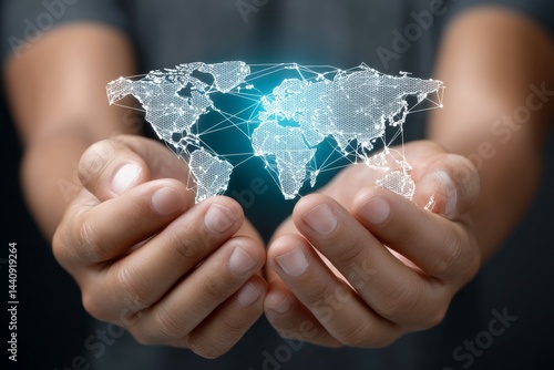 Hands holding digital world map symbolizing global connectivity