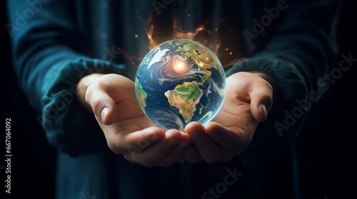 Hands holding earth, save planet, earth day, sustainable living, ecology environment, climate emergency action, world environment day concept, illustration for global warming content. Generative AI