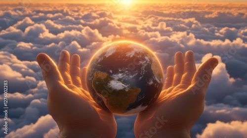 Hands Holding Earth Sunrise Cloudscape Stock Photo