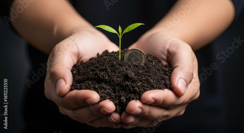 Hands holding fertile soil with a young green plant sprouting