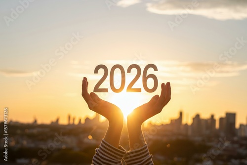 Hands holding future year against golden sunset image