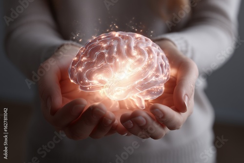Hands holding glowing brain, Cupped hands with neural brain, Conceptual image for intelligence and innovation