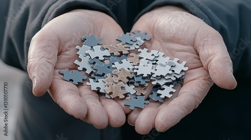 Hands Holding Gray and Beige Jigsaw Puzzle Pieces
