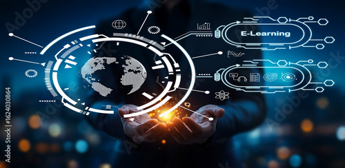 Hands Holding Light with Global Connections and Digital Interface for E-Learning Concept on Futuristic Background