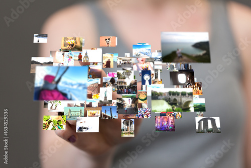 Hands holding many travel pictures, showcasing diverse destinations and memories.