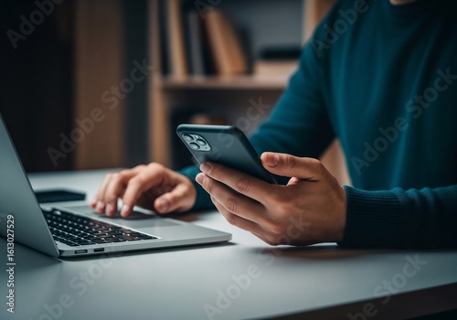 Hands holding phone, interacting with laptop, online learning, mobile banking, digital lifestyle, home office. Technology integration, e-commerce, telecommuting, financial transactions