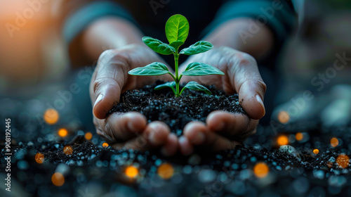 Hands Holding Small Plant Seedling Growing in Soil, Symbolizing Business Growth and Success, Concept of Nurturing and Sustainability with Warm Lighting, Close-up