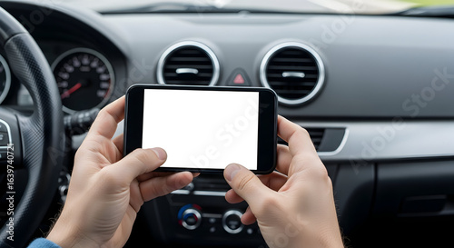 Hands holding smartphone blank screen in car modern technology travel navigation GPS app mobile device driver journey commute road trip