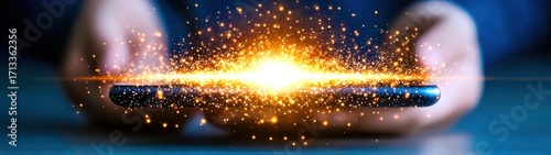 Hands Holding Smartphone with Magical Sparkle and Light Effect Illustrating Technology and Innovation