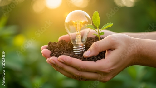Hands Holding Soil with Growing Plant and Light Bulb Symbolizing Sustainable Energy and Environmental Responsibility