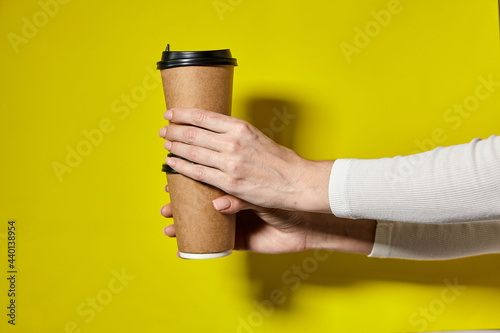 Hands holding two cups brown paper with black lid. Two coffee special offer or promo. Hands holding two cups on yellow screen background. Tea or Coffee to go. Brown paper cup with black lid.
