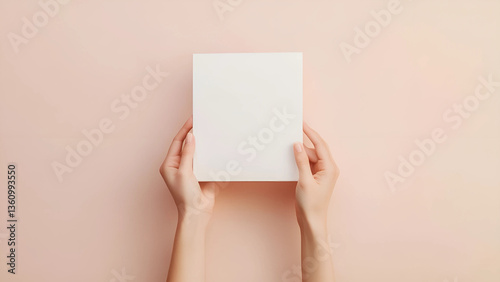 Hands holding vertical blank white card or flyer on soft pastel peach background for mockup or design presentation