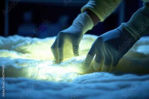 Hands in gloves examining a glowing substance on a soft surface in a dimly lit environment