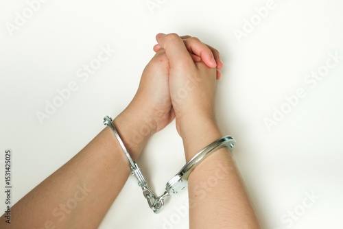 Hands in handcuffs isolated on white background. Concept of arrest, crime, punishment, law enforcement, and legal justice.