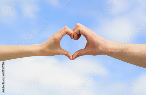 Hands in shape of love heart. Heart from hands on a sky background. Love, friendship concept. Girl and male hand in heart form love blue sky. Female and man hands in the form of heart against the sky