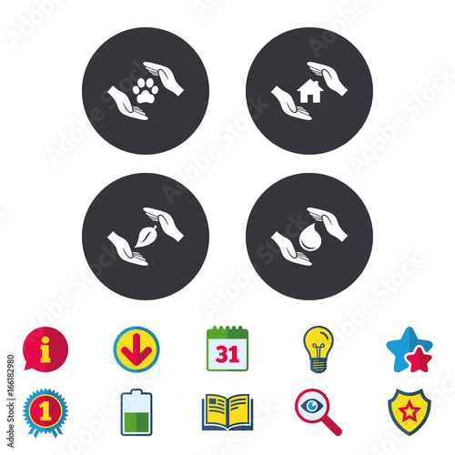 Hands insurance icons. Shelter for pets dogs symbol. Save water drop symbol. House property insurance sign. Calendar, Information and Download signs. Stars, Award and Book icons. Vector