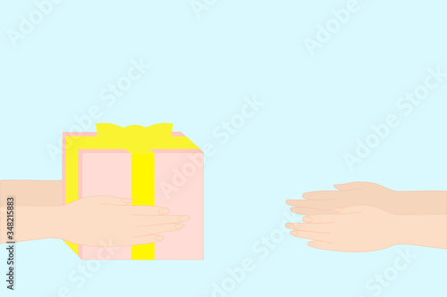 Hands is holding the pink gift box with yellow ribbon send to the other person. greeting season and celebration on holiday. Love, enjoy sharing, giving, delivery, birthday concept.
