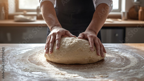 Hands kneading dough on a floured surface in a bakery kitchen. Concept of baking and artisanal food production.