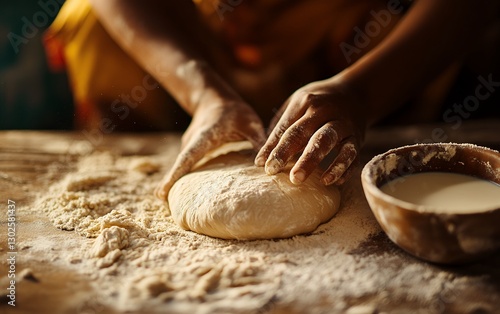 Hands kneading fresh bread dough on a rustic wooden surface with flour and a bowl of milk, captured in warm natural lighting