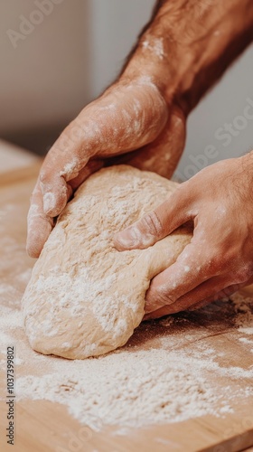 Hands kneading pizza dough with flour scattered on a rustic wooden table in a cozy kitchen, capturing culinary creativity and tradition